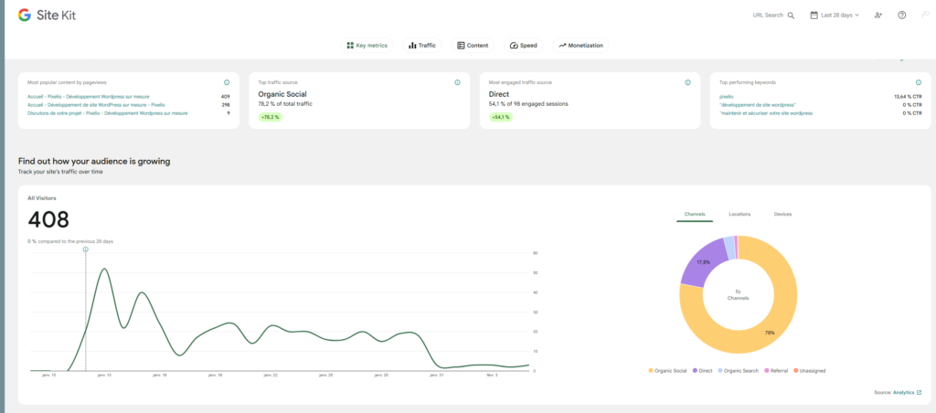 Google Site Kit est un plugin officiel de Google pour WordPress qui permet d’intégrer facilement plusieurs outils Google, tels que Google Analytics (utile pour analyser les visiteurs de votre site), Google Search Console (utile pour voir d’où et comment viennent vos utilisateurs), Google PageSpeed Insights (utile pour comprendre les performances de votre site) et AdSense (utile pour ajouter de publicités sur votre site), directement dans votre tableau de bord WordPress.